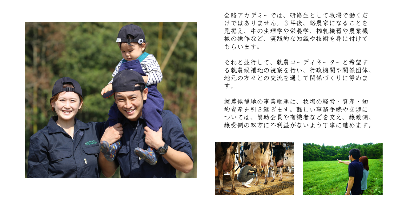 *賛助会員:本事業に賛同する全国各地の酪農協・農協などで、人材発掘、契約農場、就農候補地、就農者受入体制の整備を行います。