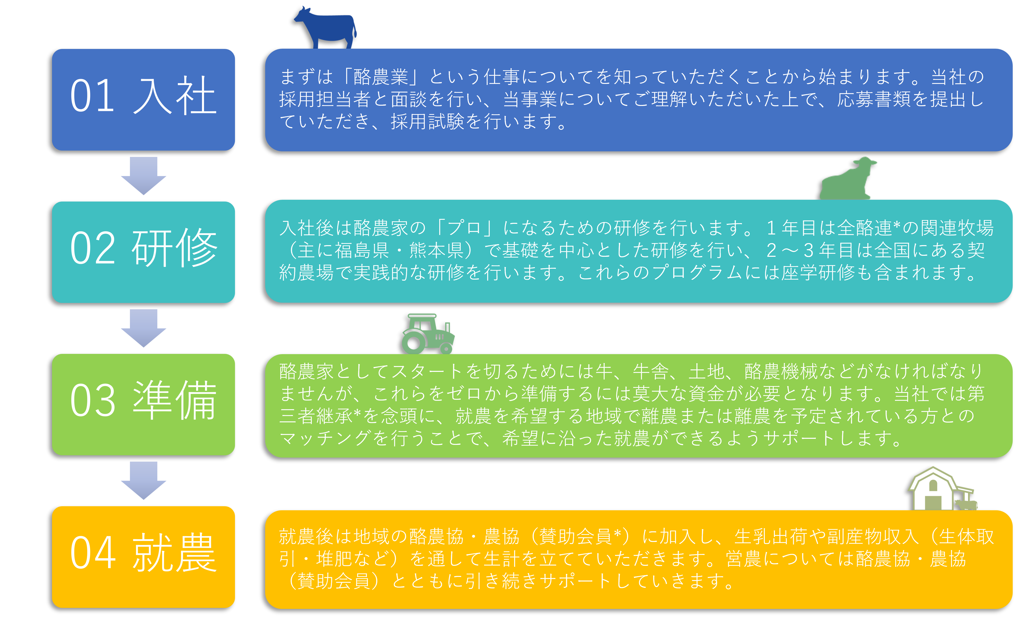 まずは酪農という仕事について知ってもらいます。採用担当者と面談を行い、その後採用試験を行います。 - 02研修